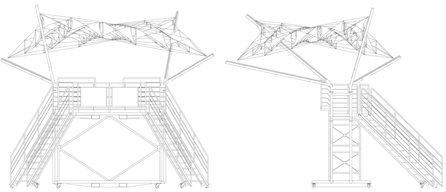 In this project, Vasku & Klug designed a customized roofing to provide spectators a shaded platform during presentations of airplane mock-ups, while also protecting them along with the airplane’s cockpit from weather exposure, including heavy rains.